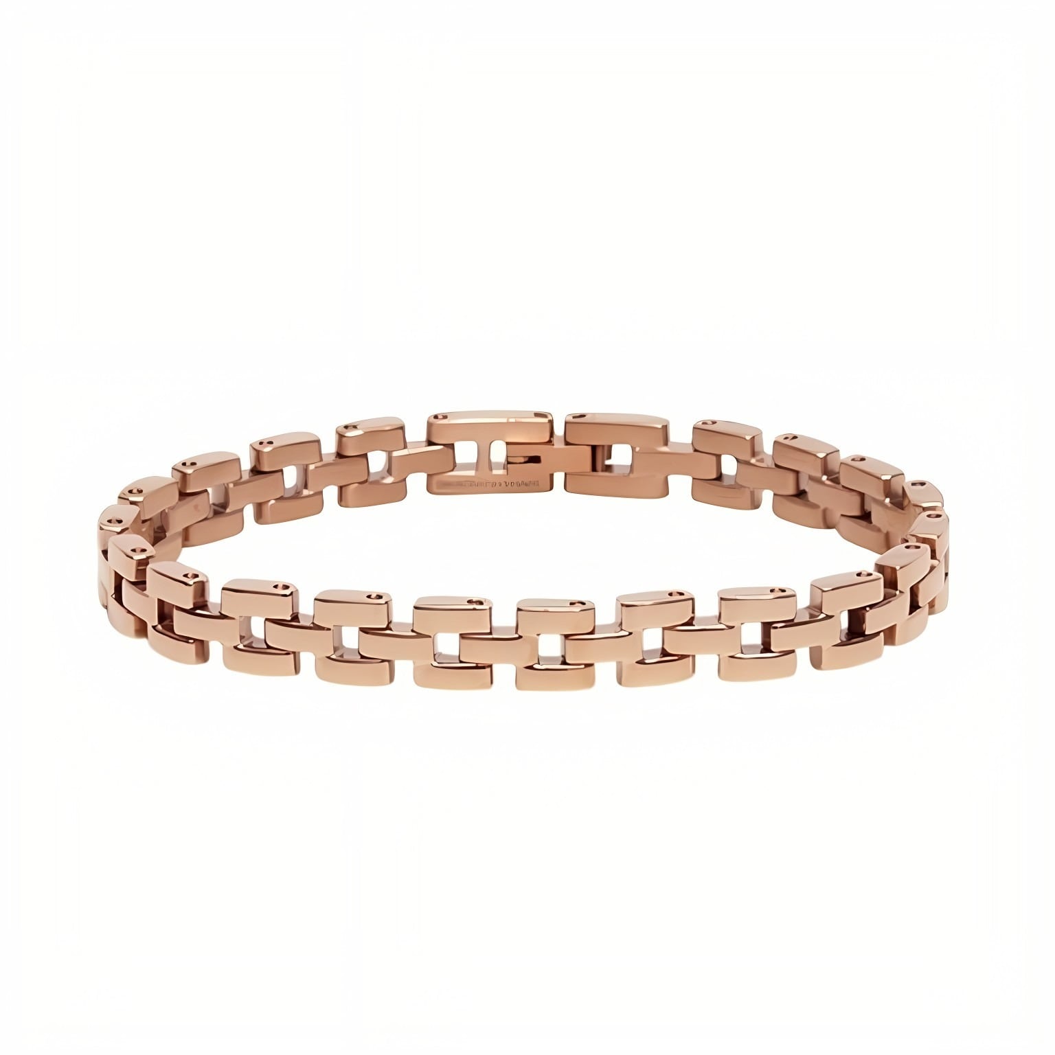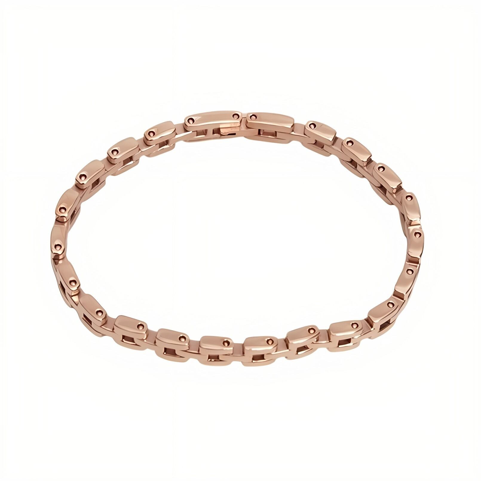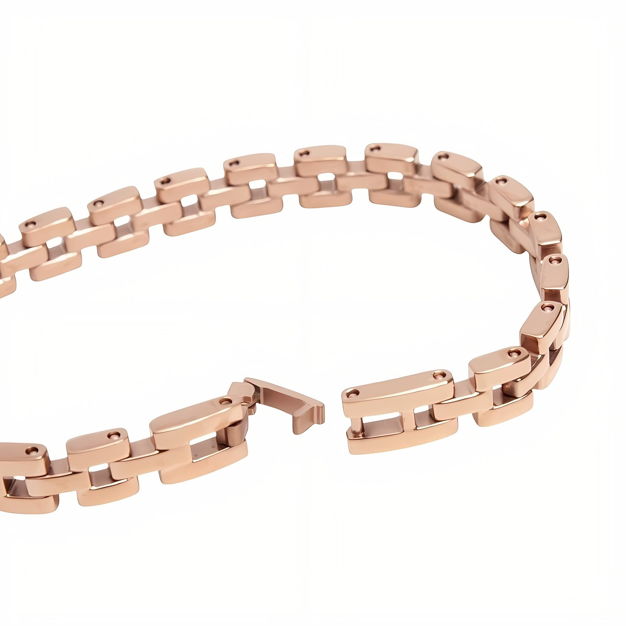 リンクウォッチストラップのデザインを更に小さく、繊細なジュエリーのように昇華させた、ローズゴールドのブレスレットです。プロポーションはそのままに、リンクにゆとりをもたせることで洗練されたルックを演出します。単体でも、お気に入りのウォッチと合わせても。大胆なデザインが手元に印象的な輝きを与えます。