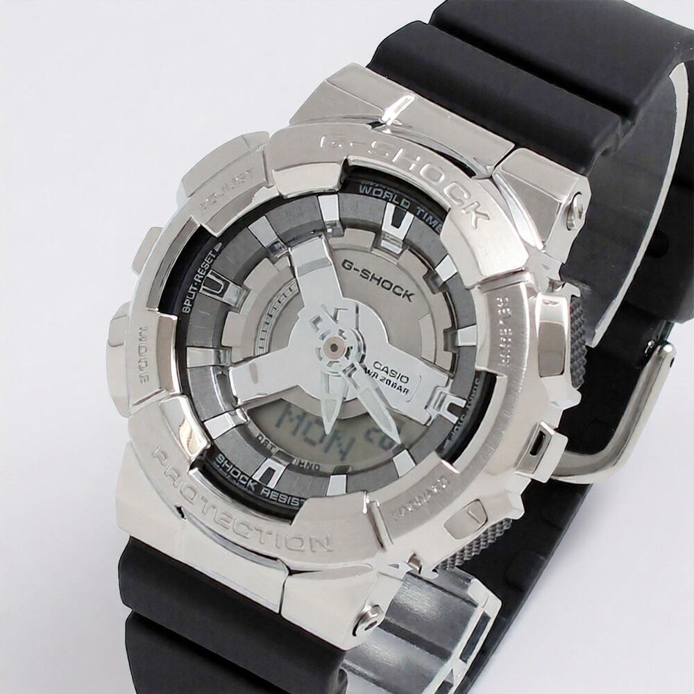 G-SHOCKの人気のデジタル・アナログコンビモデル110シリーズから、メタルをまとい、小型化・薄型化したモデルです。 GM-110を小型化し軽量で快適な着け心地を実現しました。 細かなパーツが積み重なった立体的な文字板デザインに、デジタル表示と時針・分針がバランスよく配置され視認性を高めています。ベゼルカバーにはメタル(ステンレス素材)を使用し、メタリック調の文字板パーツと共に上質でクールな印象を引き出します。バンドにはクリーンな印象のフラットバンドを採用しました。スポーティなデザインにスタイリッシュなムードをプラスしたG-SHOCKです。