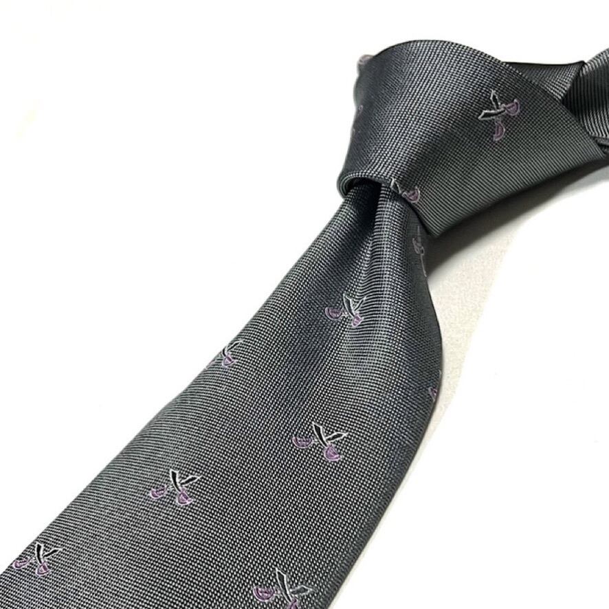 控えめながらも印象的な剣モチーフの刺繍が施され、洗練されたデザインが特徴です。シックなグレー地に細かな織り柄が加わることで、奥行きのある表情を演出。さらに、剣モチーフの刺繍には落ち着いたパープルが使用され、上品なアクセントになっています。