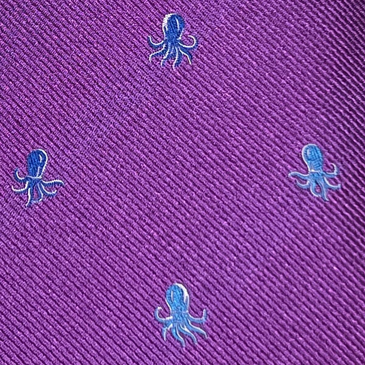 鮮やかなパープルの生地にブルーとグリーンのタコが均等に配置され、ユニークで個性的なデザインが魅力です。シルク100%の上質な素材は、しなやかで光沢があり、結びやすく、洗練された印象を与えます。