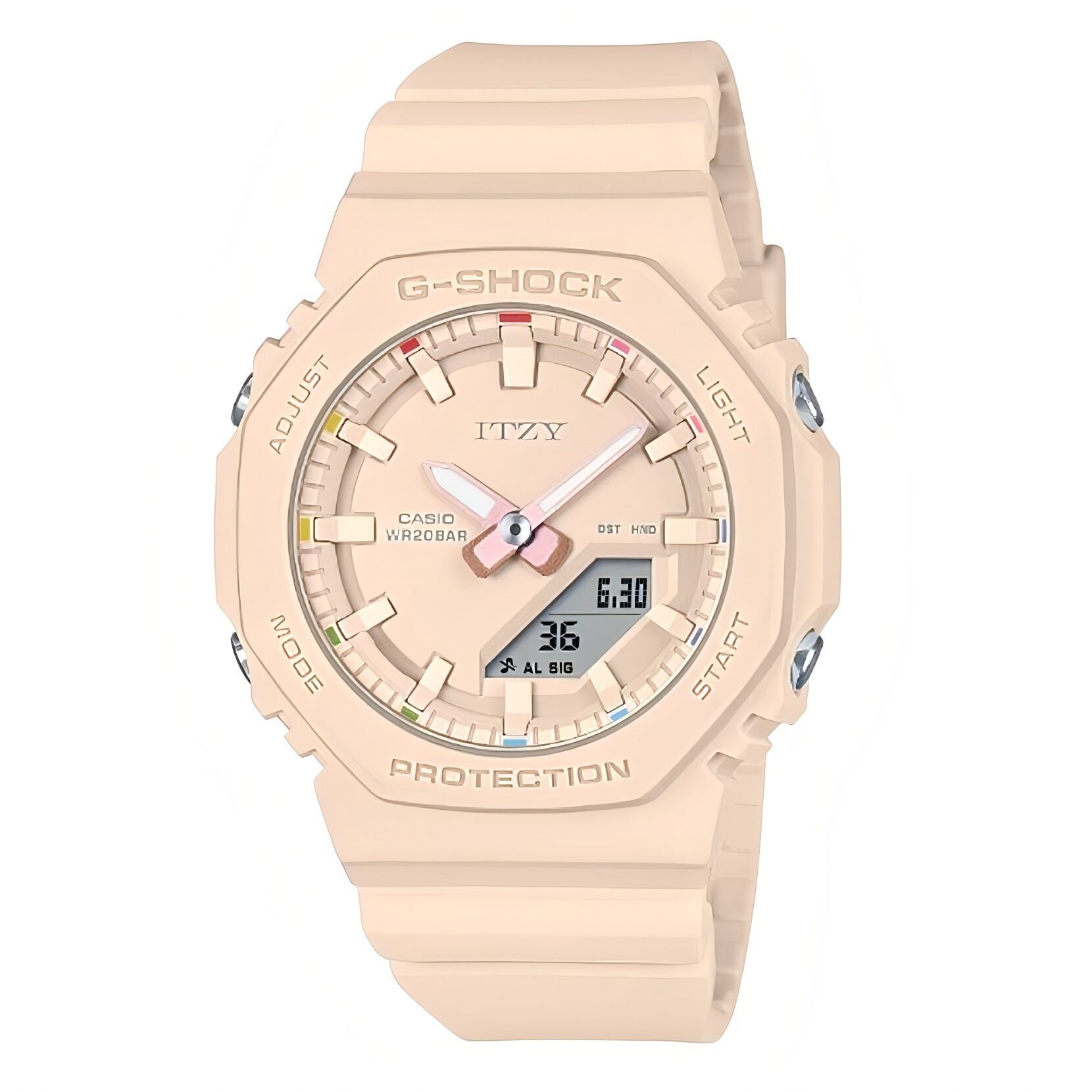 G-SHOCKのアンバサダーを務めるITZYとの待望のコラボレーションモデルです。ITZYの公式グッズであるライトリングをイメージしたマルチカラーをアクセントとしてインデックス上部に配色。シンプルなデザインの中にも、MIDZYへの想いが込められたデザインとなっています。文字板の12時位置にITZYのロゴを配し、裏蓋にもITZYのロゴが刻印されたスペシャルなモデルです。 ベースモデルは、人気のデジタル・アナログコンビモデルから、小型、薄型化を追求したGMA-P2100シリーズ。バンドの長さも短くすることで、華奢な手元によりフィットするように装着性を高めました。 パッケージはメンバー5人のプリントサイン入りの特別仕様となっています。ITZYメンバーのこだわりがつまったスペシャルなコラボレーションモデルです。